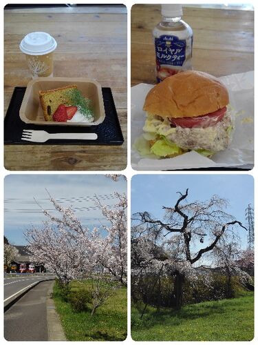 令和4年4月1日(金) ご近所の桜🌸 道の駅織部の里もとす。風の蛍さんのジビエオープンサンド🍔。 これ、うまい‼️ 鹿肉も臭みがなく、野菜がまた新鮮でおいしい😋。 さらにシフォンケーキ🍰。これまた超うま! 褒めすぎ!? でもうまい。