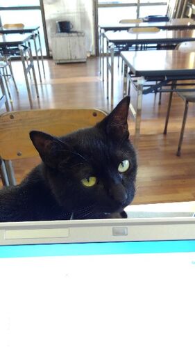令和5年7月22日(土) 教室で飼っている3びきのクロネコのうちの1匹、「テカ」。今月でおよそ3歳8ヶ月。